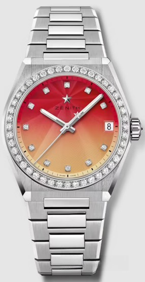 Часы Zenith Defy Classic Midnight представлены в корпусе из нержавеющей стали размером 36 мм водонепроницаемостью 10 метров. Внутри корпуса установлен автоматический механизм, Калибр Elite 670, обладающий запасом хода 50 часов. На красном циферблате с 11-ю белыми бриллиантами отображаются часы, минуты, секунды, дата. Часы поставляются на браслете из нержавеющей стали. Безель из белых бриллиантов.