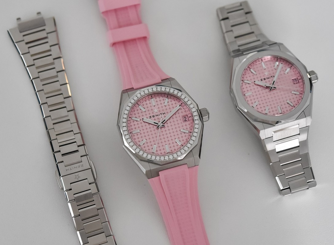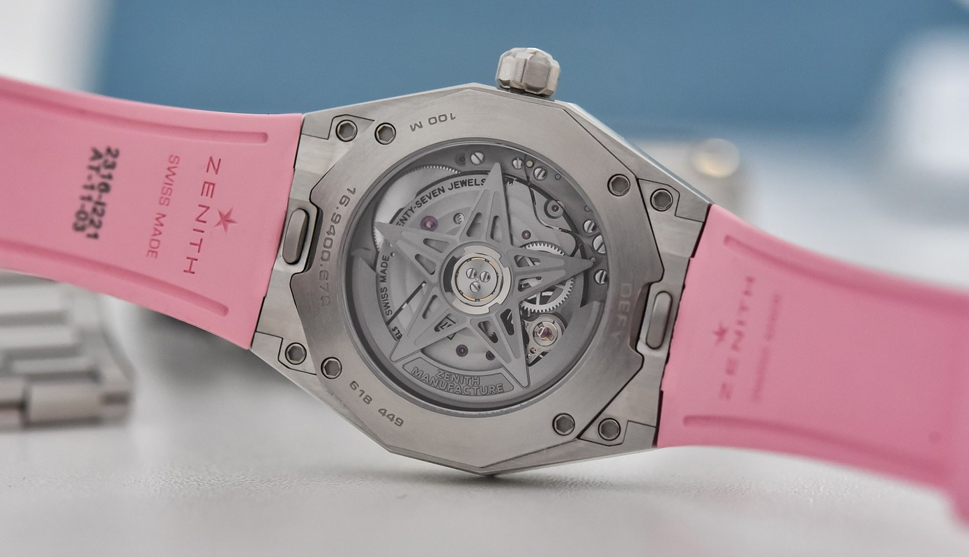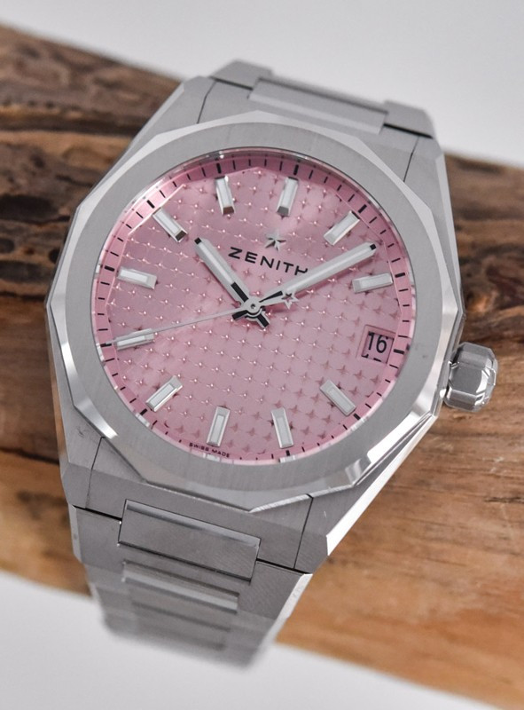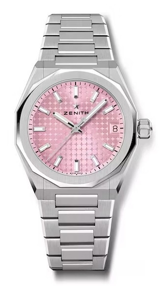 Часы Zenith Defy Skyline 36 mm представлены в корпусе размером 36 мм из нержавеющей стали водонепроницаемостью 100 метров. Внутри корпуса установлен автоматический механизм, Калибр Elite 670, обладающий запасом хода 50 часов. На розовом гильошированном циферблате отображаются часы, минуты, секунды, дата. Часы поставляются на браслете из нержавеющей стали.