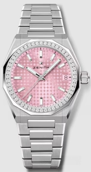 Часы Zenith Defy Skyline 36 mm представлены в корпусе размером 36 мм из нержавеющей стали водонепроницаемостью 100 метров. Внутри корпуса установлен автоматический механизм, Калибр Elite 670, обладающий запасом хода 50 часов. На розовом циферблате отображаются часы, минуты, секунды, дата. Часы поставляются на браслете из нержавеющей стали. Безель из белых бриллиантов.