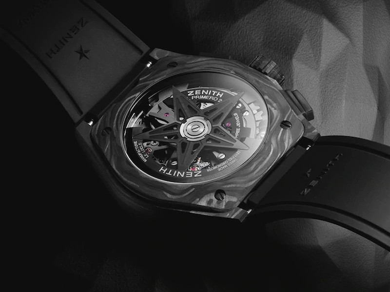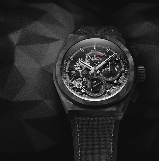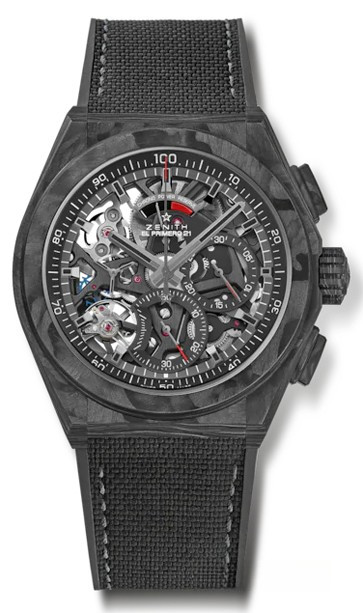 Defy El Primero 21 олицетворяет новое поколение хронографов Zenith, в основе которых лежит современная механика, дополненная бесподобными динамическими, оптическими и акустическими характеристиками. Заслуживает отдельного внимания корпус толщиной 44 мм из карбона. Оснащенный рифленой заводной головкой и кнопками управления хронографом, корпус с его короткими ушками демонстрирует сочетание сатинированных и полированных поверхностей, отлично смотрится на текстильном ремешке, оснащенном двойной раскладывающейся застежкой. Счетчик сотых долей секунды создает верный визуальный эффект благодаря внутреннему кольцу безеля с нанесенной на него градуированной шкалой с делениями от 0 до 100, по которому молниеносно проносится стрелка, выполняющая полный оборот всего за одну секунду. Непрерывно движущаяся секундная стрелка с противовесом в форме звезды, широкие стрелки прямоугольной формы с люминесцентным покрытием и фацетированные часовые отметки: все основные отличительные особенности El Primero на месте.