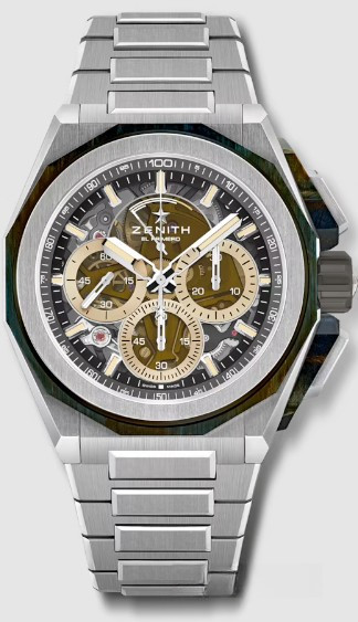 Часы Zenith Defy Extreme представлены в корпусе из титана размером 45 х 15.4 мм водонепроницаемостью 200 метров. Внутри корпуса установлен автоматический механизм, Калибр El Primero 9004, обладающий запасом хода 50 часов. На корчневом скелетированном циферблате отображаются часы, минуты, секунды, накопители хронографа. Часы поставляются на титановом браслете. Серия ограничена - 50 шт.