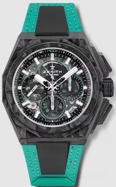 Часы Zenith Defy Extreme представлены в корпусе из карбона размером 45 х 15.4 мм водонепроницаемостью 200 метров. Внутри корпуса установлен автоматический механизм, Калибр El Primero 9004, обладающий запасом хода 50 часов. На черном циферблате отображаются часы, минуты, секунды, накопители хронографа. Часы поставляются на каучуковом ремешке с застежкой из нержавеющей стали.