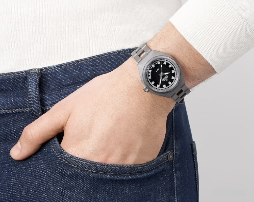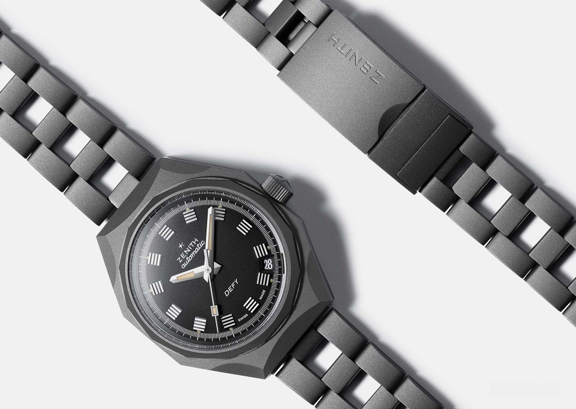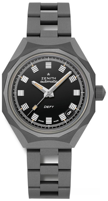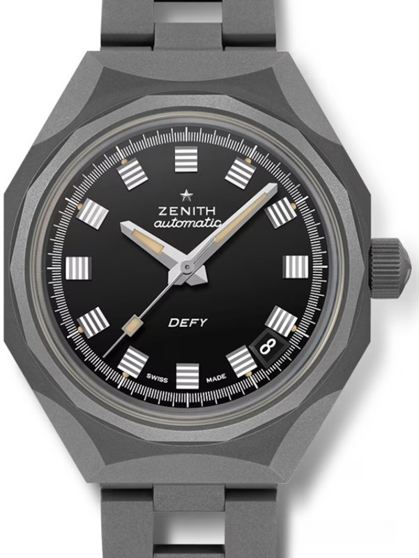 Часы Zenith Defy Revival A3642 представлены в корпусе диаметром 37 мм из титана водонепроницаемостью 300 метров. Внутр корпуса установлен автоматический механизм, Калибр Elite 670, обладающий запасом хода 50 часов. На черном циферблате отображаются часы, минуты, секунды, дата. Часы поставляются на браслете из титана.