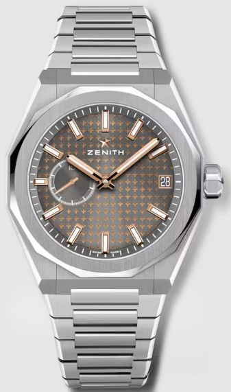 Часы Zenith Defy Skyline представлены в корпусе диаметром 41 мм из нержавеющей стали водонепроницаемостью 100 метров. Внутр корпуса установлен автоматический механизм, Калибр El Primero 3620, обладающий запасом хода 60 часов. На сером циферблате отображаются часы, минуты, секунды, дата. Часы поставляются на браслете из нержавеющей стали.