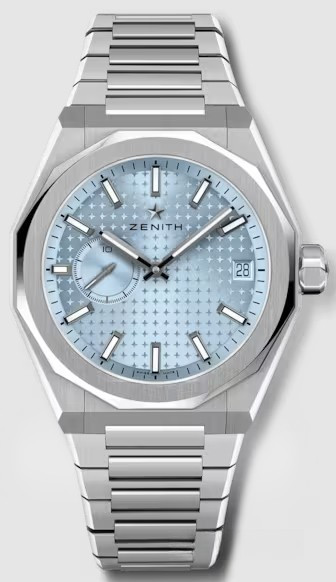 Часы Zenith Defy Skyline представлены в корпусе диаметром 41 мм из нержавеющей стали водонепроницаемостью 100 метров. Внутр корпуса установлен автоматический механизм, Калибр El Primero 3620, обладающий запасом хода 60 часов. На голубом циферблате отображаются часы, минуты, секунды, дата. Часы поставляются на браслете из нержавеющей стали.