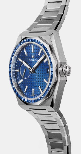Часы Zenith Defy Skyline представлены в корпусе диаметром 41 мм из нержавеющей стали водонепроницаемостью 100 метров. Внутр корпуса установлен автоматический механизм, Калибр El Primero 3620, обладающий запасом хода 60 часов. На синем циферблате отображаются часы, минуты, секунды, дата. Часы поставляются на браслете из нержавеющей стали. Безель из синих сапфиров.