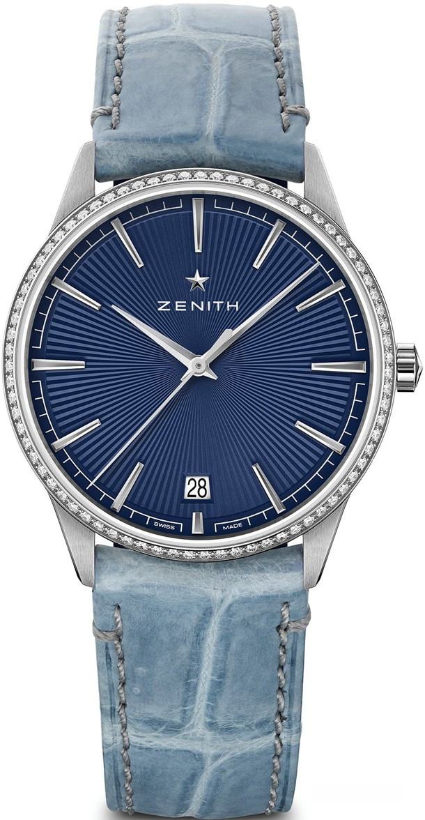 Часы Zenith Elite Classic 36 представлены в корпусе размером 36 мм из нержавеющей стали с водонепроницаемостью до 50 метров. Внутри корпуса установлен автоматический механизм, Калибр Elite 670 SK, обладающий запасом хода 48 часов. На синем гильошированном циферблате отображаются часы, минуты, секунды, дата. Часы поставляются на ремешке из кожи аллигатора с вставкой из нержавеющей стали. Безель из белых бриллиантов.