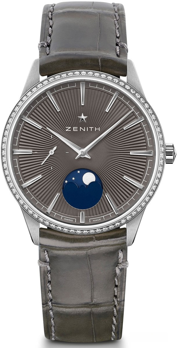 Часы Zenith Elite Lady Moonphase комплектуются автоматическим механизмом с запасом хода 50 часов. При помощи центральных стрелок отображаются часы и минуты, секунды отображаются на 9-ти часах, индикатор фазы Луны находится в позиции 6-ти часов. Корпус часов диаметром 36 мм изготовлен из нержавеющей стали, водонепроницаемость составляет 50 метров. Сапфировое стекло покрывает лицевую и заднюю часть корпуса, покрыто антибликовым слоем. Циферблат часов серый гильошированный. Часы комплектуются ремешком из кожи аллигатора с вставкой из нержавеющей стали. Безель из белых бриллиантов.