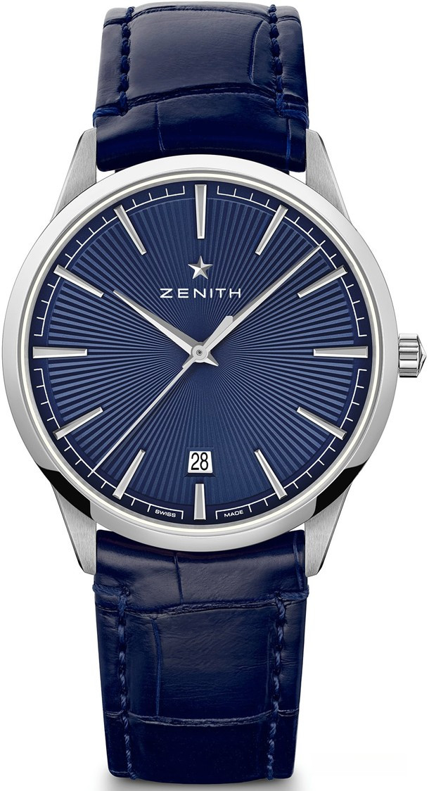 Часы Zenith Elite Classic 40.5 представлены в корпусе размером 40.5 мм из нержавеющей стали с водонепроницаемостью до 50 метров. Внутри корпуса установлен автоматический механизм, Калибр Elite 670 SK, обладающий запасом хода 48 часов. На синем гильошированном циферблате отображаются часы, минуты, секунды, дата. Часы поставляются на ремешке из кожи аллигатора с вставкой из нержавеющей стали.