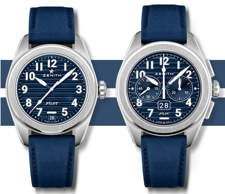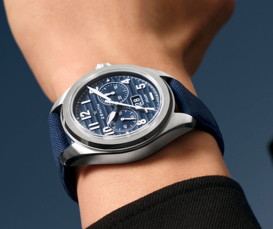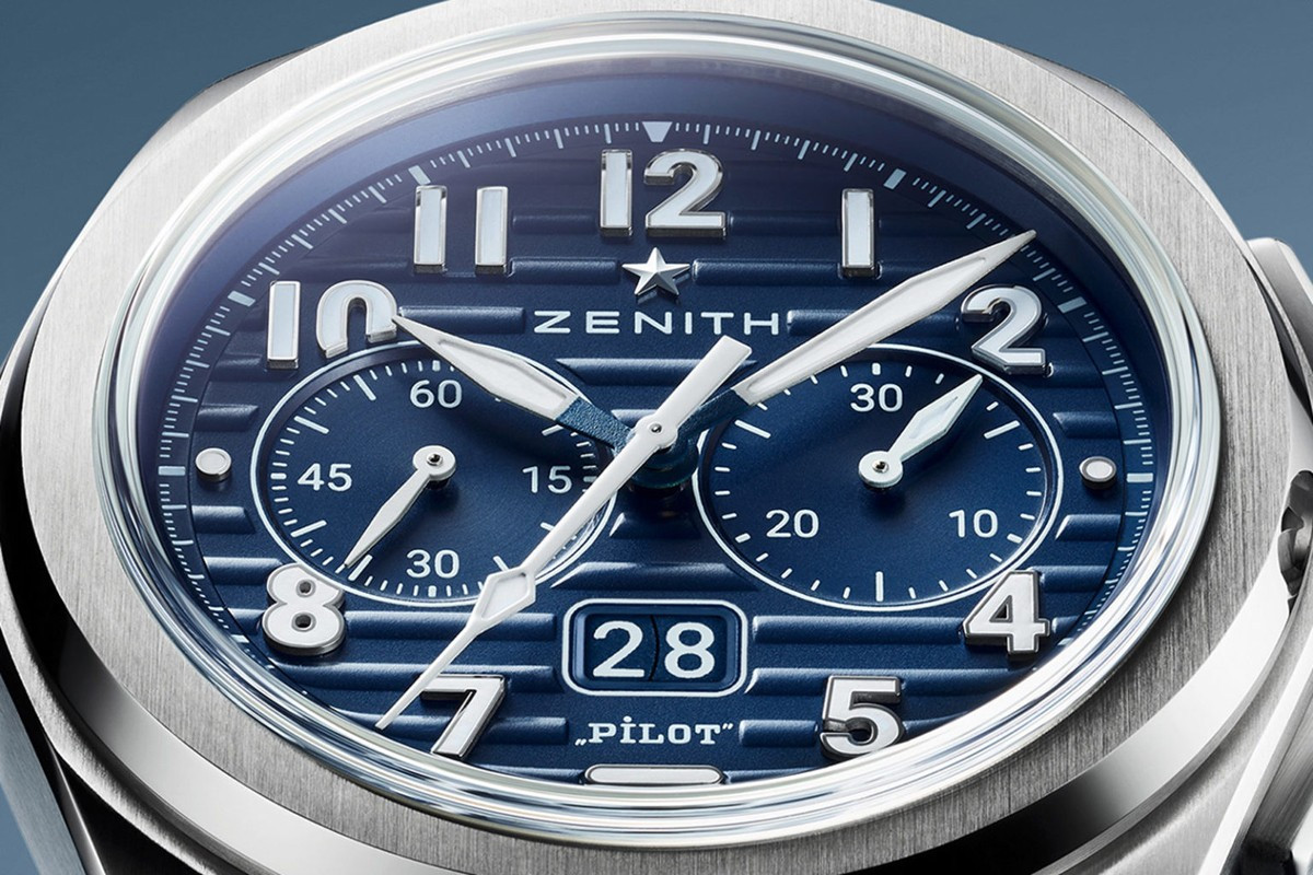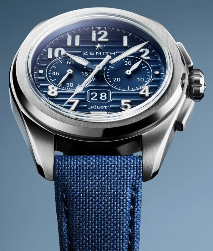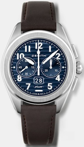 Часы Zenith Pilot Big Date Flyback представлены в корпусе размером 42.5 мм из нержавеющей стали водонепроницаемостью 100 метров. Внутри корпуса установлен автоматический механизм, Калибр 3652, обладающий запасом хода 60 часов. На синем гильошированном циферблате отображаются часы, минуты, секунды, дата, хронограф. Часы поставляются на кожаном ремешке с застежкой из нержавеющей стали.